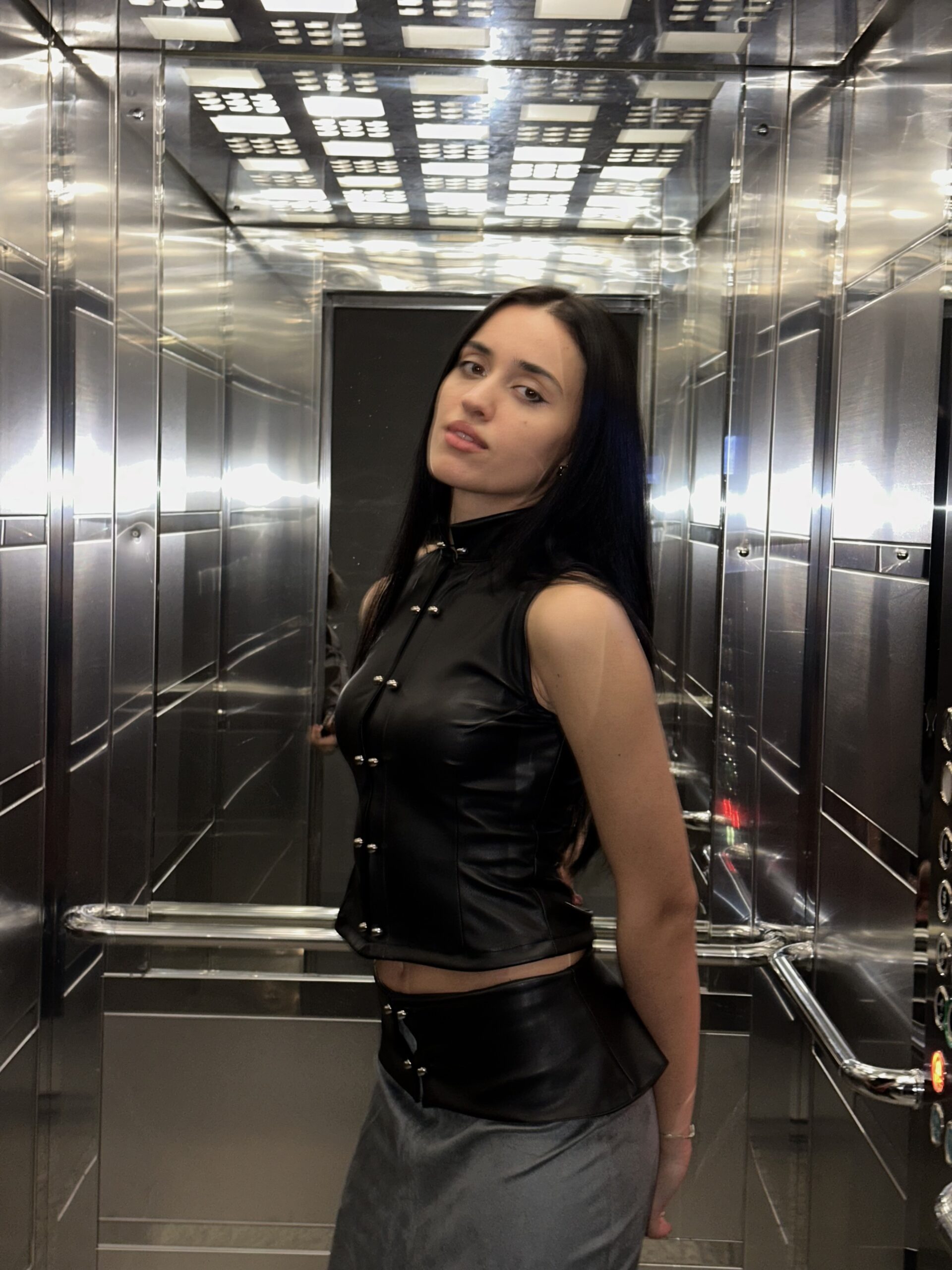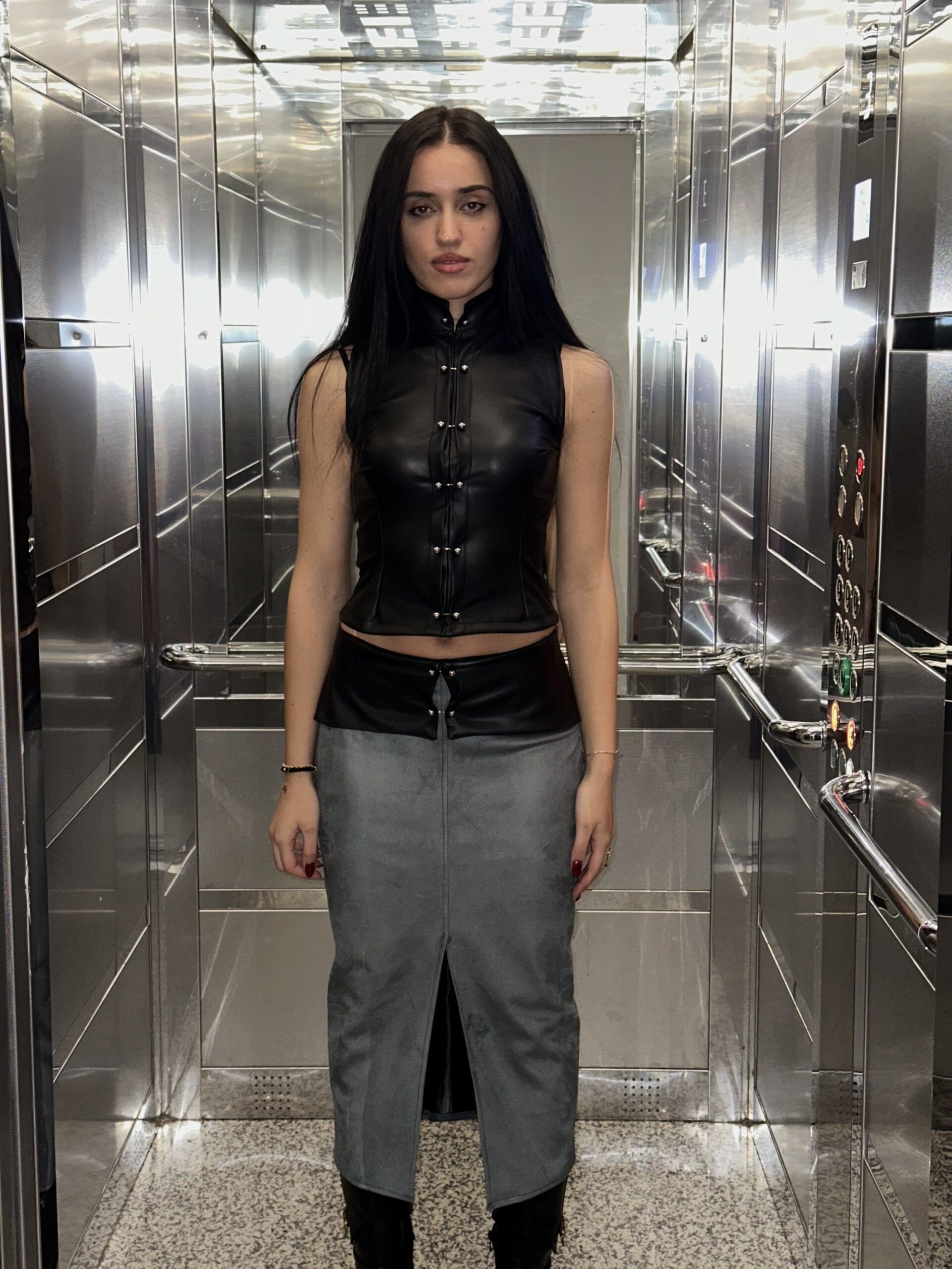 A black leather top with silver piercing details and a grey suede ,black leather ,silver details skirt.